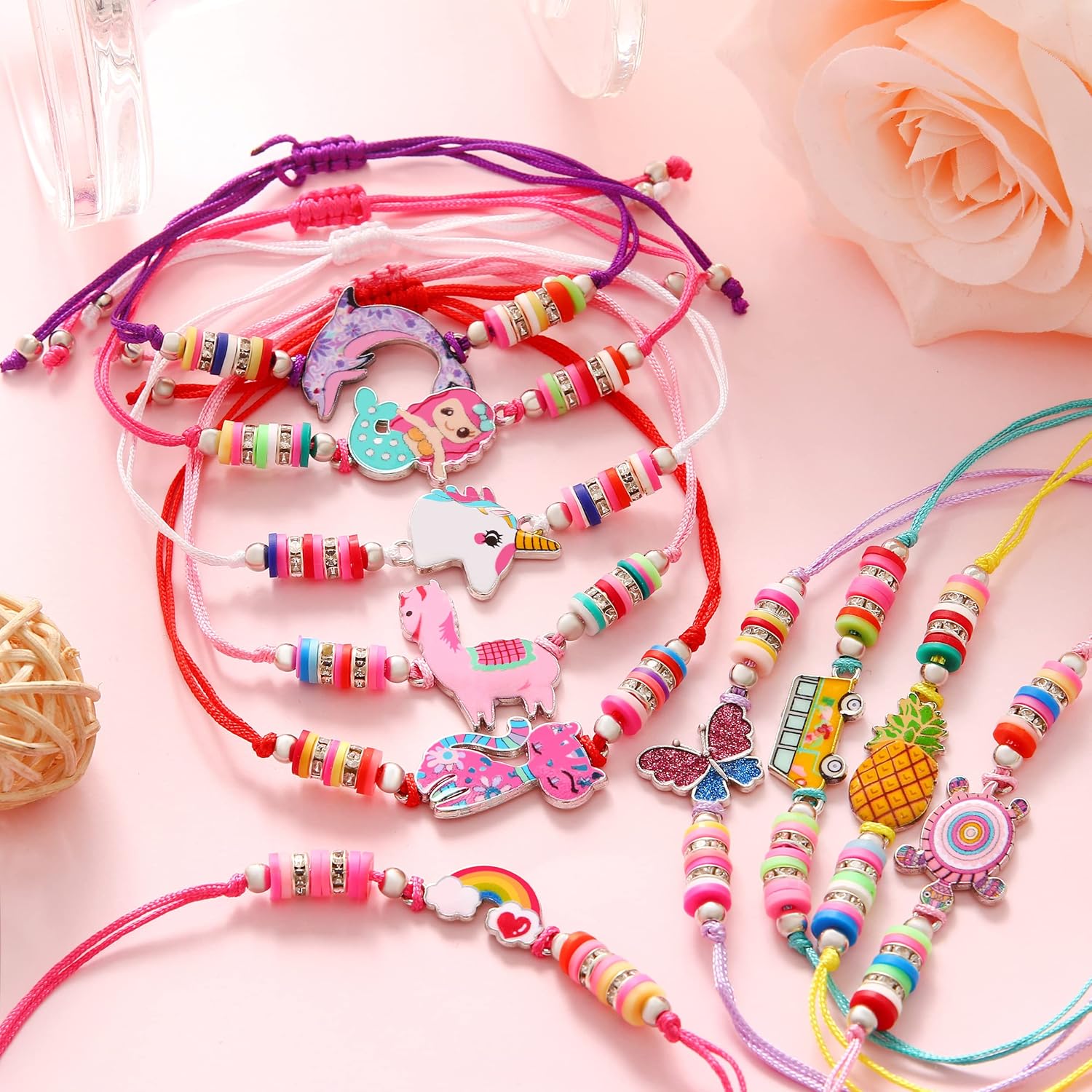 This kids girls women party favor jewelry includes 12 pcs bracelet, 12 pcs different style such as unicorn, moon, heart sunglasses, pineapple, panda, turtle and any other patterns. Providing you with different styles to meet your daily matching.
